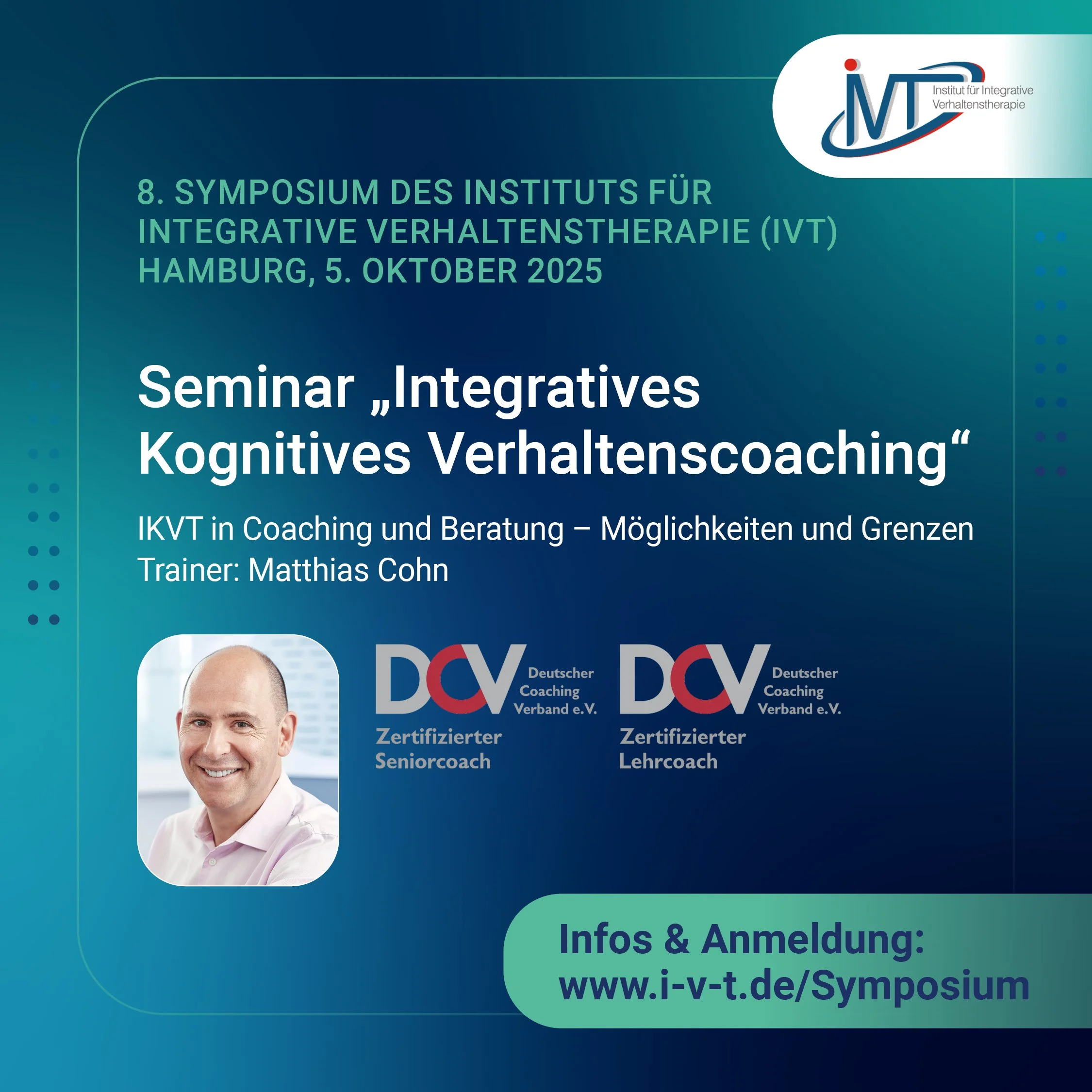Wenn Sie als Coach tätig sind und einen Einblick in den hocheffektiven Ansatz des Integrativen Kognitiven Verhaltenscoaching gewinnen möchten, sind Sie herzlich zu meinem Seminar am 5. Oktober auf dem 8. Symposium des Instituts für Integrative Kognitive Verhaltenstherapie in Hamburg eingeladen. Infos dazu gerne per Mail oder telefonisch bzw. direkt beim Veranstalter der IVT-Hamburg: https://i-v-t.de/Symposium/.